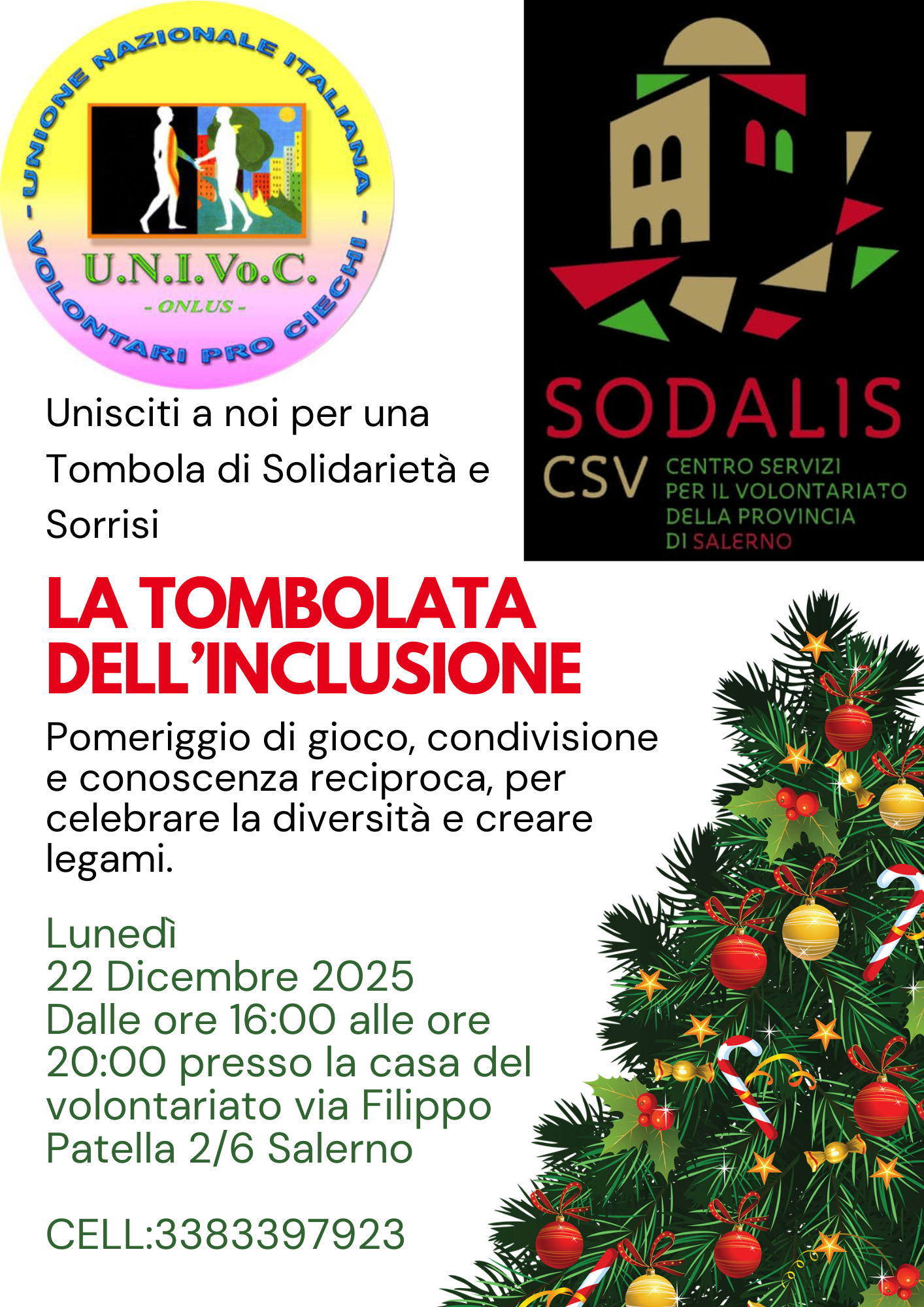 Anche quest'anno l'UNIVOC di Salerno in collaborazione con l'UICI di Salerno, organizza la Tombolata di solidarietà. Un momento di aggregazione e convivialità con i soci volontari e i soci dell'Unione Italiana dei Ciechi e Ipovedenti di Salerno.